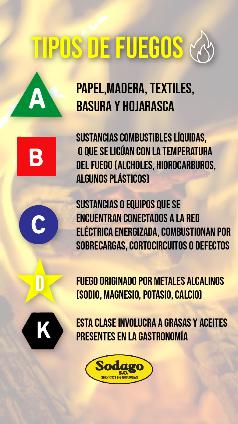 ✔️Clase D: Es el fuego originado por metales alcalinos (sodio, magnesio, potasio, calcio, etc.) cuya peligrosidad radica en su alta reacción con el oxígeno. Este tipo de incendio está representado por una estrella de cinco picos de color amarillo, con la letra “D”.